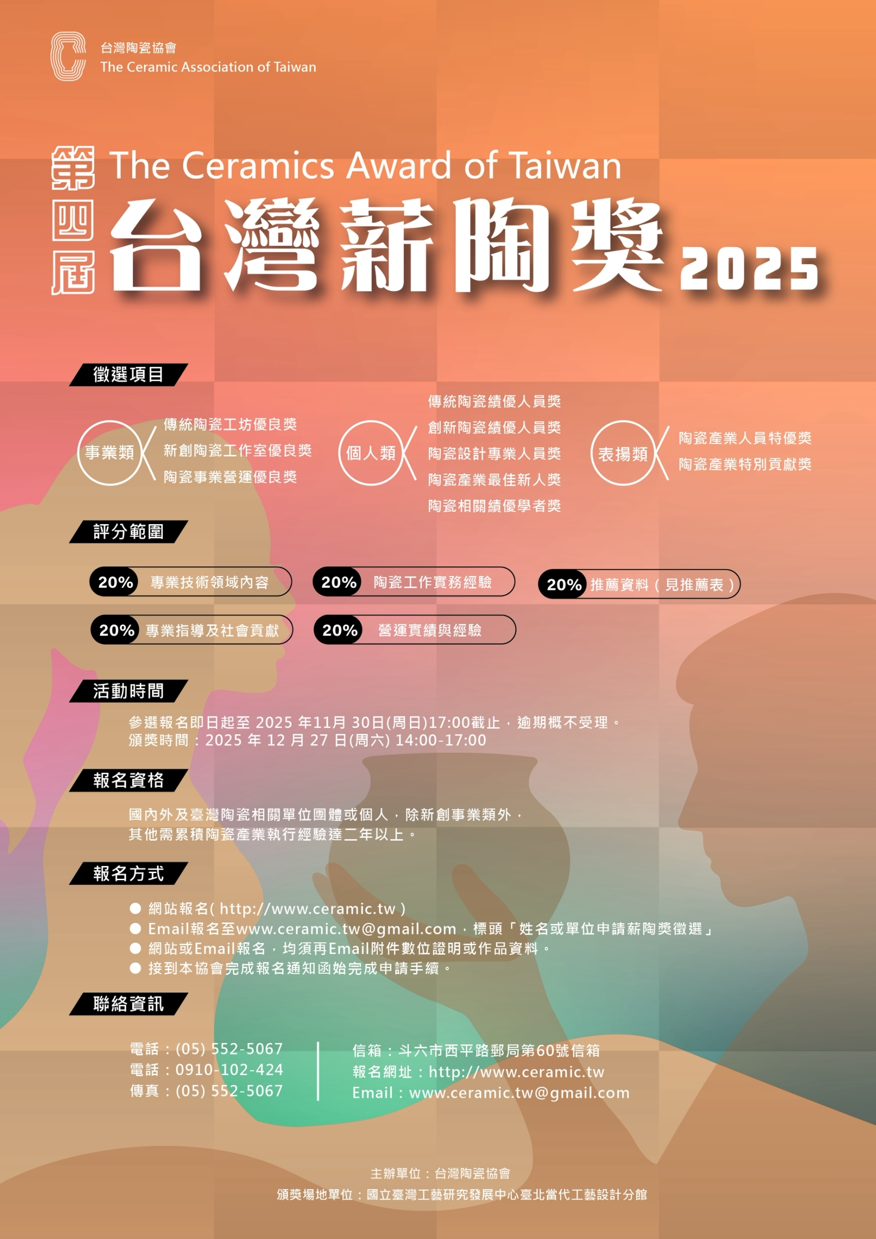 113 年 12 月 22 日,台灣陶瓷協會於國立工藝研究發展中心台北當代工藝設計分館隆重舉辦 「台灣薪陶獎」頒獎典禮。此獎項旨在推動陶藝創新,表彰優秀陶藝家,並促進陶藝在台灣的永續發展。